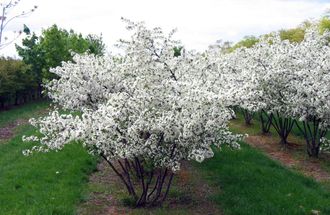 Крона округло-пирамидальная с коротким стволом. Бутоны розовые, цветки белые, до 2 см в диаметре.